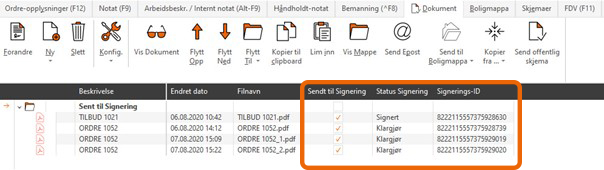 - Status Signering – viser hvor i signeringsprosessen dokumentet er.