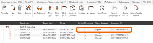 Dokumenter sendt til signering vil bli lagret under ordren/tilbudet sine dokument og under kundens dokument. I dokumentfanen vil du enkelt se status for dokument sendt til signering og hvor i signeringsprosessen dokumentet er. I dokumentfanen vil man finne tre felt som gir informasjon om filene som er sendt til signering. Disse er: