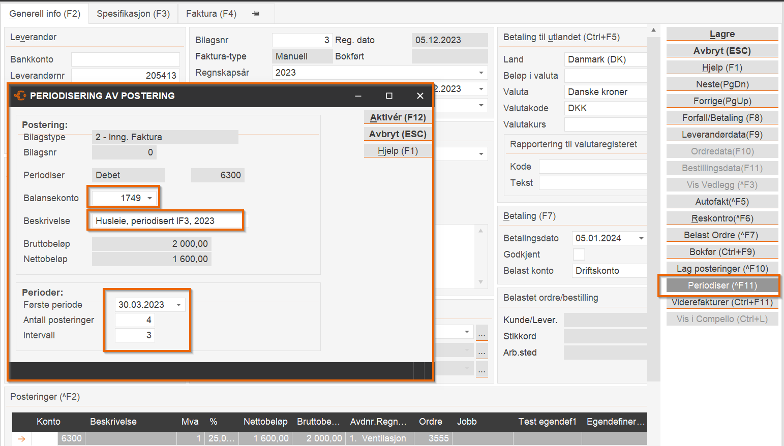 Man har muligheten til å periodisere kostnad på en inngående faktura over flere perioder uavhengig av år, som for eksempel ved en inngående faktura på husleie. For å periodisere fakturaen legger du den først inn på helt normal måte, men før man lagrer og bokfører trykker man på knappen som heter «Periodiser» eller hurtigtasten [^F11] når man står inne på den inngående fakturaen man skal periodisere.