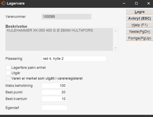 | "Best.punkt" | Programmet foreslår å bestille vara når beholdning tangerer eller er under bestillingspunkt. |