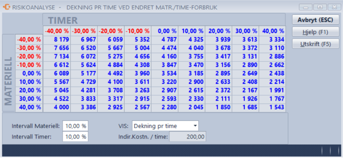 - Her ser du dekning/fortjeneste per time, og hvilke utslag som gjør seg gjeldende dersom du bruker mer/mindre timer/materiell enn planlagt.