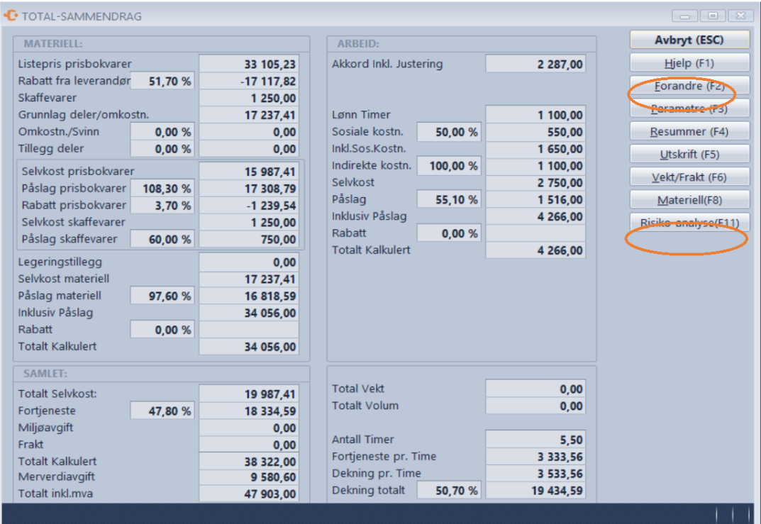 - Trykk på Forandre for å endre påslag, dekning eller gi en totalrabatt for hele tilbudet.