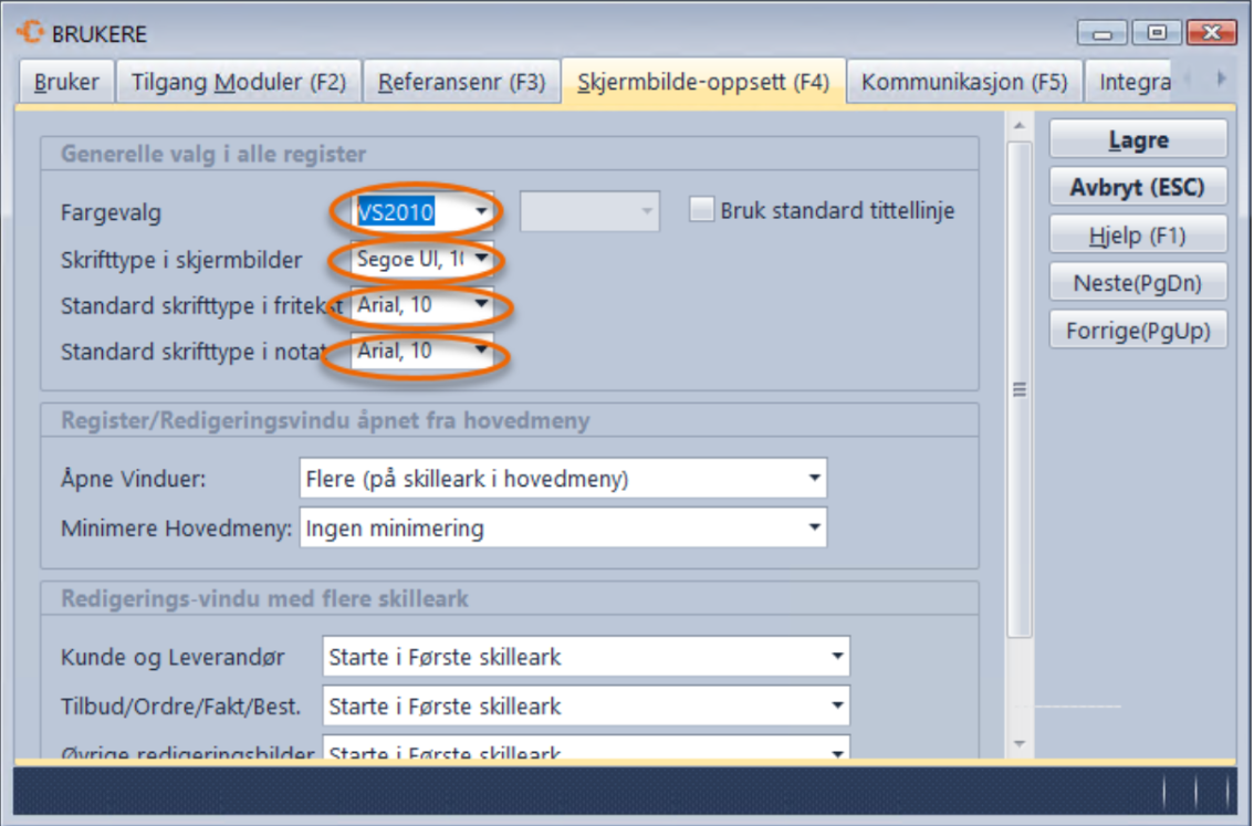 - Der får du opp valgmuligheter for layout/fargevalg, samt standard skrifttyper i skjermbilder, fritekst og notat. Velg ønskede innstillinger og avlutt med Lagre (Sh+Ent)