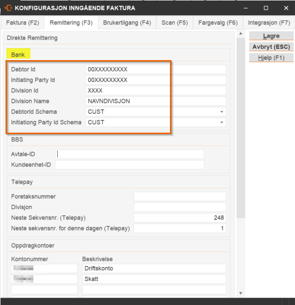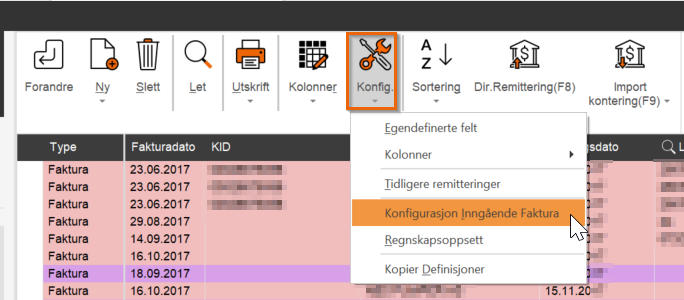 Andre endringer utføres i Hele menyen -> Remittering -> Konfig -> Konfigurasjon inngående faktura.