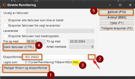 Neste gang du skal remittere og trykker på Dir.Remittering(F8), trykk først på knapp Rediger filnavn og eksportformat, velg "ISO20022" i rubrikken Eksportformat og endre "etternavnet" til eksportfilen til .XML
