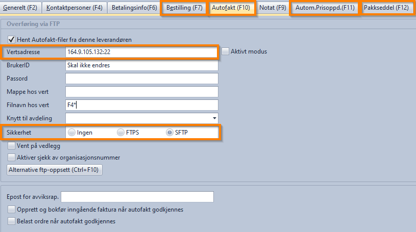 Endringen som må gjøres er å legge til ":22" bak vertsadresse og sette på krysset for SFTP i Bestilling/Autofakt/Autom.Prisoppd./Pakkseddel fanene i leverandørkortet til Ahlsell Norge AS. Brukernavn og passord er uendret.