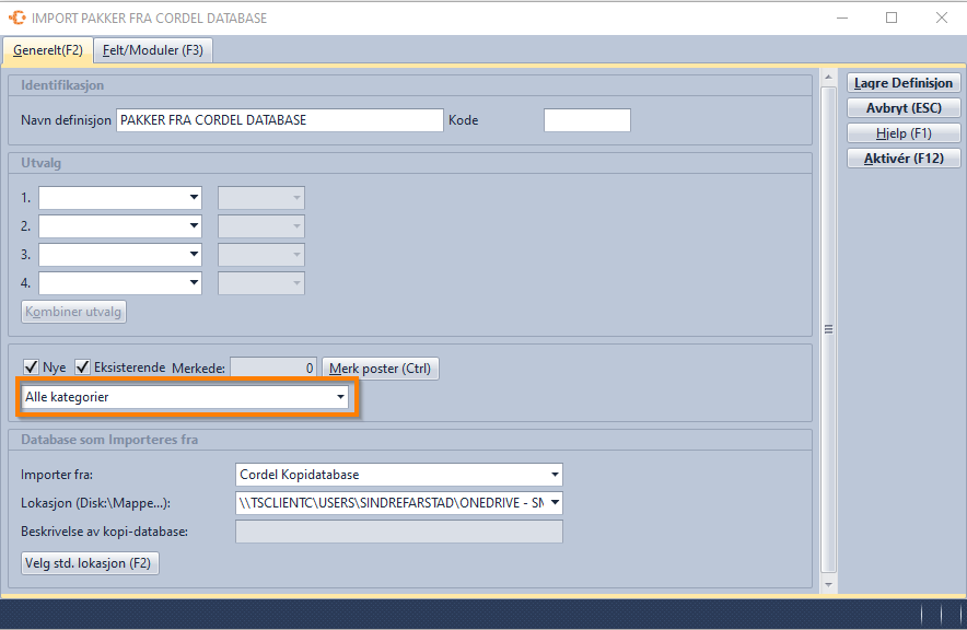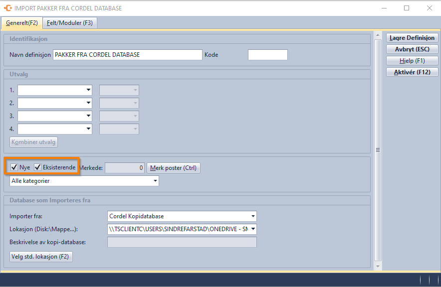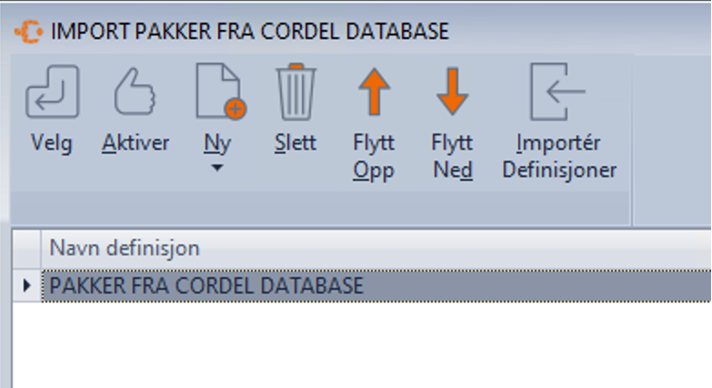 - Klikk på «Lagre» og gå inn på «Import» – «Fra Cordel database» - marker definisjonen du lagde i steget over og klikk «Aktiver»