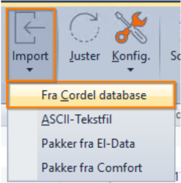 - Hele Menyen –> Basisregister –> Pakker –> Import –> «Fra Cordel database»