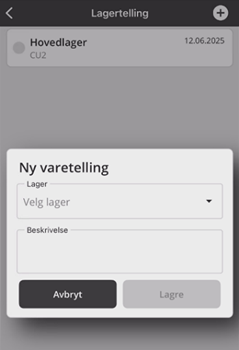 Gå inn på menyvalget «Lagertelling». Her vil du se dine lagertellinger og ha mulighet til å legge til en ny ved å trykke på .