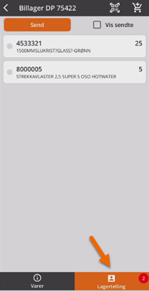 Når du har telt ferdig går du til «Lagertelling». Her kan du se over tellingen din og evetuelt justere antall gjennom å klikke på ønsket vare og endre antallet. Du kan også sveipe for å slette hele varelinjen om den er feil.