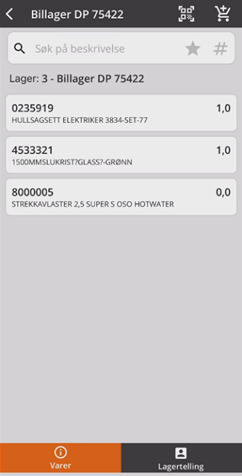 Gå inn på aktuell varetelling. Du får nå opp en liste over lagerførte varer. Finn frem til rett vare og trykk på denne. Legg inn korrekt antall og trykk Lagre». Gjenta for neste vare. Du kan også skanne varer Det er også mulig å legge til varer basert på varenummer, samt velge varer fra prisbok