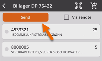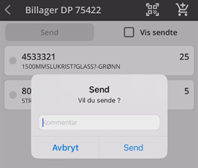 Når du har sett over varetellingen din og du har en korrekt liste kan du fullføre varetellingen. Det gjør du ved å trykke på «Send». Du får så et sikkerhetsspørsmål om du ønsker å sende og avslutte lagertellingen, samt legge til en kommentar. Trykk Send om du ønsker å sende, trykk Avbryt om du må endre noe/se over listen en gang til.