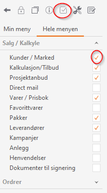 Hver bruker kan definere sitt eget menyoppsett slik de selv ønsker. Dette gjøres ved å velge «Hele menyen» og klikke på knappen «Definer Min meny» i Cordel. Her kan man huke av for det man ønsker ha med i «Min meny».