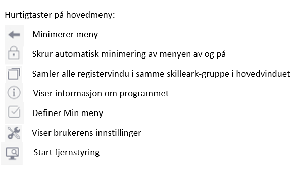 I hovedmenyen finner du flere hurtigtaster – her er en oversikt over de forskjellige: