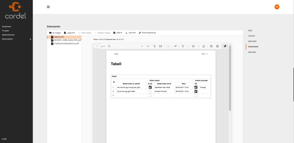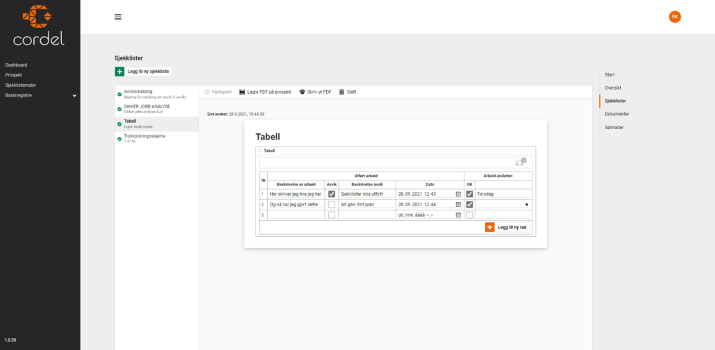 Tabellpunktet lar deg komprimere dine sjekklister gjennom mer informasjon per rad. Du vil også få mulighet til å lage mer dynamiske sjekklister, da du vil kunne legge til nye rader etter hvert som du trenger det, også i Cordel UTE.