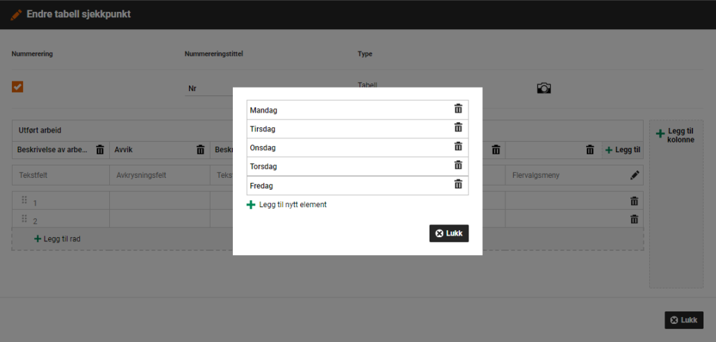 Tabellpunktet lar deg velge mellom tekst, nummerering, dato, informasjon eller en nedtrekkmeny, og du kan selv enkelt velge innhold. Tabellpunktet gir også brukere av Cordel UTE mulighet til å legge til eget alternativ i en nedtrekkmeny om alternativene som finnes ikke er passende. Dette uavhengig om sjekklisten er laget av dere eller Cordel.