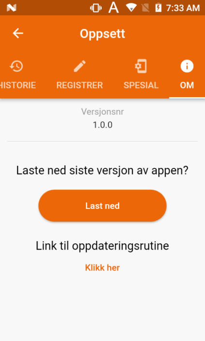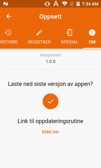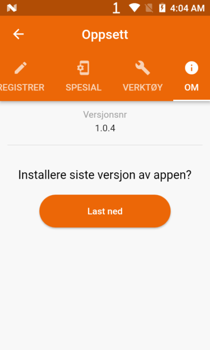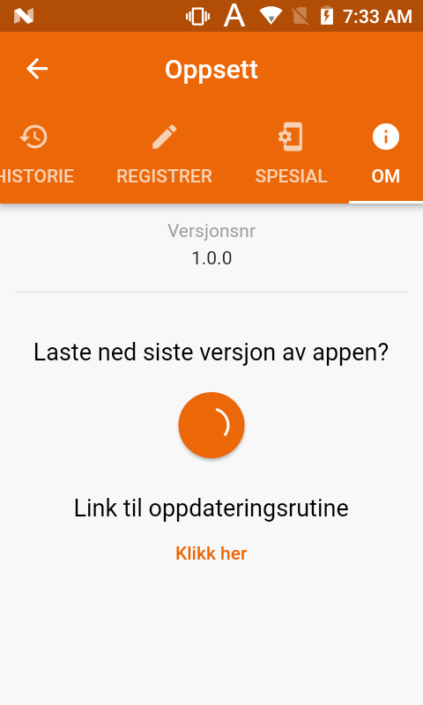 Merk: I versjon 1.0.1 ble oppdatering av applikasjonen forenklet. Har du versjon 1.0.0 hopp ned til «Oppdatering av håndterminal-applikasjon 1.0.0». Hvilken versjon du har installert på din håndterminal finner du ved å åpne applikasjonen, velge innstillinger (tannhjulet) og bla til fanen «OM».