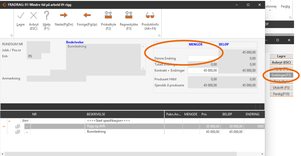Dersom det blir endringer i kontraktens mengder underveis i prosjektet kan endringer utføres i mappen «KontraktEndr. (F5)». Dette er viktig å gjøre endringene i denne mappen da du dermed har kontraktens opprinnelige mengder i «Spesifikasjonen (F2)» og historiske endringer i «KontraktEndr. (F5)». Legg merke til at kontraktsendring er endring i antall (tillegg eller fradrag) mot kontraktens (spesifikasjonens) opprinnelige antall, og vil ikke bli fakturert for seg, kun avgjøre hvor mye som skal kunne meldes produsert. Har du for eksempel 3 stk av vare x i spesifikasjonen og legger inn en endring på et fradrag på 1 stk av vare x vil du kunne melde 2 stk produsert av vare x når du melder produsert verdi.