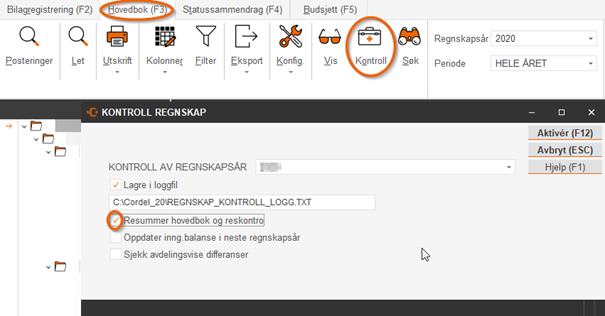 Kjør rutinen, og kryss av for resummering av reskontro. Dersom du kjører rutinen på siste regnskapsår, får du kun dette krysset. Kjøres rutinen på et regnskapsår tidligere enn siste regnskapsår vil man også kunne velge å overføre evt. rekalkulerte saldoer til neste regnskapsår. Når «Kontroll» er utført velger du å se resultatet av rutinen, og du får fram en rapport på skjermen over hvilke bilag Cordel mener du bør kontrollere. Denne rapporten finner du også som en fil i Cordel-mappen. Filen heter «Regnskap-kontroll-logg.txt».